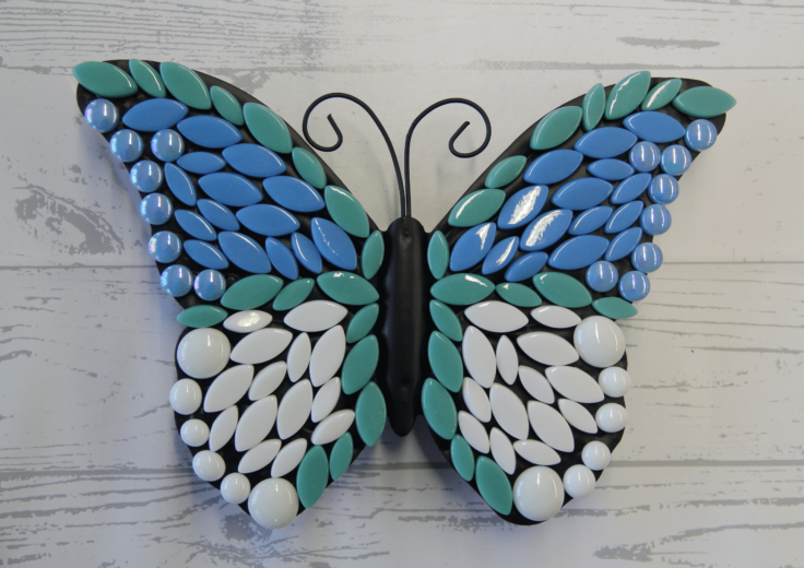Je lijmt de gekleurde glassteentjes vast op de vlinder en je laat de lijm dan 24 uur drogen. Vanaf de volgende dag kun je de mozaïek voegen. Je kunt de vlinder maken zoals het voorbeeld, maar je kunt uiteraard ook in een ander patroon mozaïeken.
