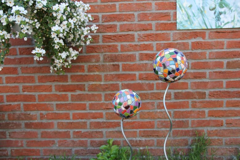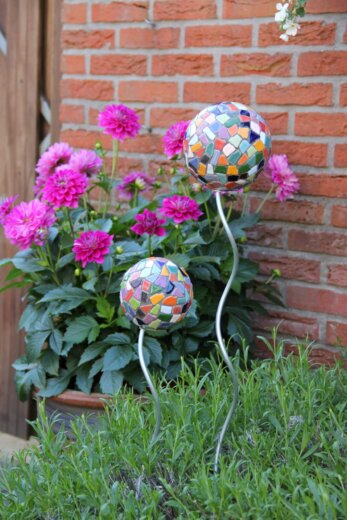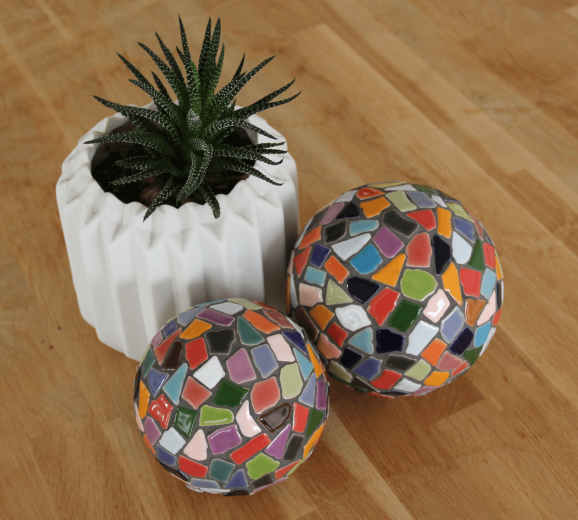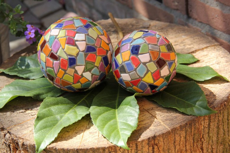 Je lijmt de gekleurde steentjes vast op de bollen en je laat de lijm dan 24 uur drogen. Vanaf de volgende dag kun je de mozaïek voegen. Een aanrader om een paar uur creatief en ontspannen bezig te zijn.