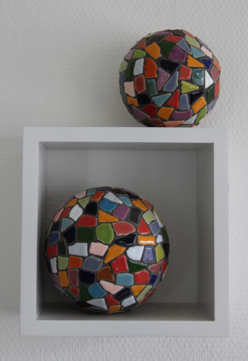Je kunt 2 kleurrijke, vrolijke bollen maken met een compleet mozaïekpakket.