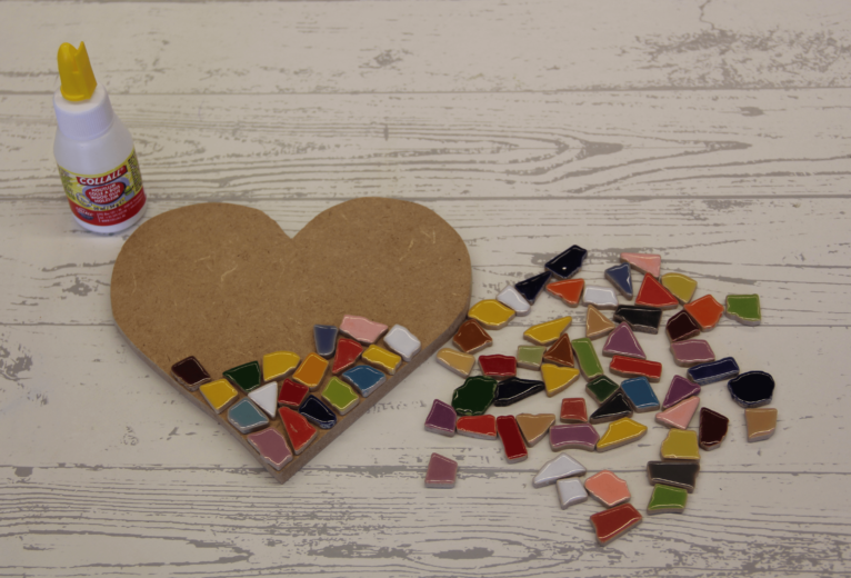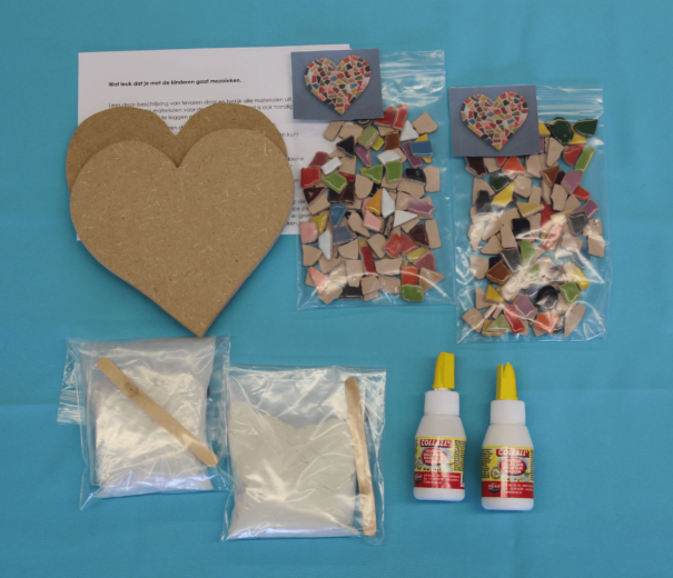 Tijdens het feestje lijmen de kinderen de mozaïeksteentjes op de hartjes. In het pakket zit voor jou een uitleg hoe ze dat moeten doen.