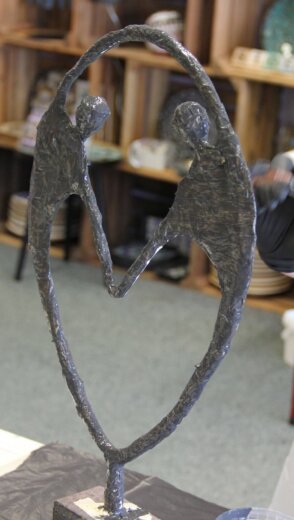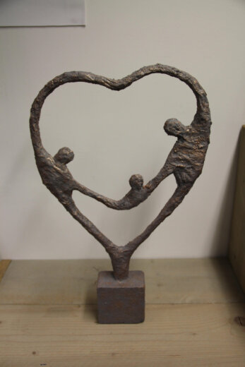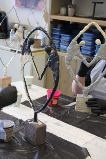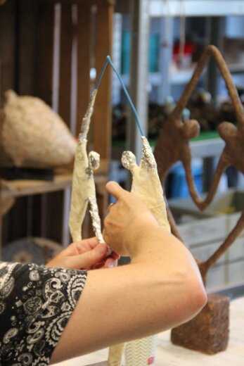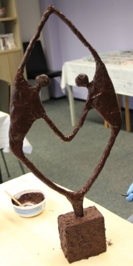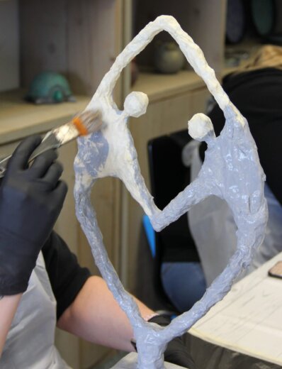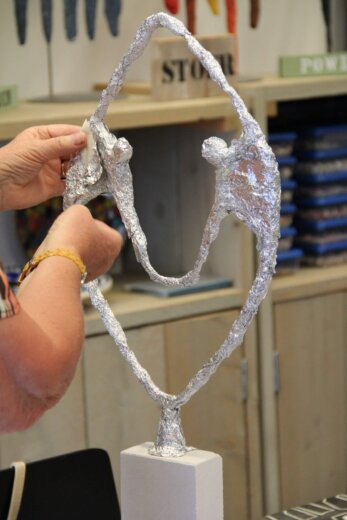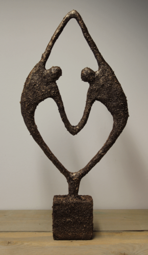 Eerst maak je de basis van Verbonden met aluminiumfolie. Je bedekt het beeld daarna met een pasta die gemaakt is van Powertex en poedervormige Stone Art. Tot slot werk je Verbonden af door te brushen met een metallic verf in de kleur die je zelf kiest.